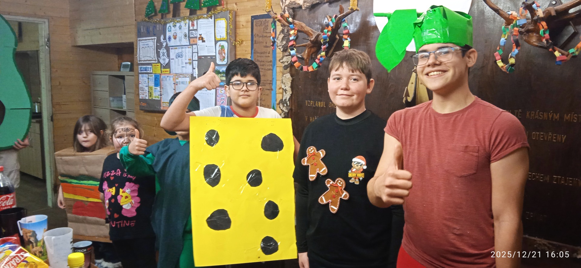 V neděli pár dní před štědrým dnem se Hraničáři společně sešli v klubovně, aby tradičně oslavili Vánoce. Téma kostýmů bylo jídlo, a proto se všichni sešli v krásných kostýmech od jablka až po salát nebo zmrzlinu. K našemu převleku jako jídlo každý donesl i Barbuchu, přeci jenom je nálada a atmosféra lepší, když je do čeho se zakousnout. Stůl se proto naplnil slanými a sladkými pochutinami. Jako obvykle se hrálo o to, kdo ochutná Barbuchu jako první. Hrála se pro to hra na pamatování: "babička šla do obchodu a koupila si:" Tuto hru vyhrál Bořek a proto započal naší hostinu. V průběhu nejmladší člen, který uměl číst, Markét, rozdávala dárečky. Zprvu se rozdávaly ty, které byly označeny jmenovkou, ve kterých se nacházelo vše od dárečků "vysypaný šuplík" až po praktické maličkosti nebo vtipné drobnosti. Poté nastal i čas pro neoznačené dárky, které se náhodně rozdávaly všem v místnosti a byly plné jak legračních blbostí, tak věcí, které byly praktické nebo obecně hezké. Poté, co zmizelo všechno jídlo a rozbalil se poslední dárek se pustilo do úklidu všeho balícího papíru, drobků z Barbuchy a dalšího nepořádku, vzniklého v průběhu. Celý večer se zakončil hrou Elektrika a Cinkačka, kde proti sobě soupeřily obě posádky a také naším pokřikem, který byl posledním tohoto roku 2025. Věřím, že celá akce byla vydařená a každý si jí užil. Zase máme nějaké další společné vzpomínky. Pro některé první Mejdánek, pro jiné ne, ale kostýmy ho určitě zpestřily a odlišily od zbylých.